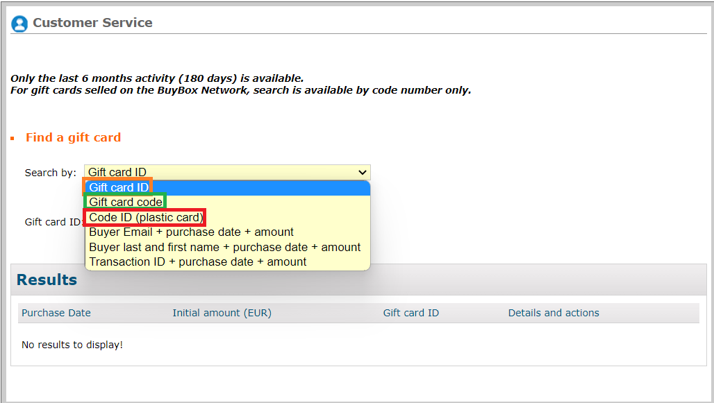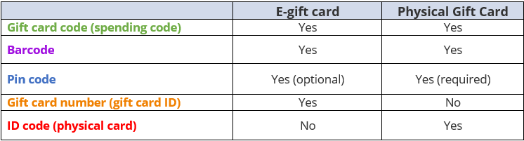 ID code (physical card) : This is the unique ID code provided by the processor, It can be printed on the physical card or not. This code can be used by your customer service to identify a physical gift card.