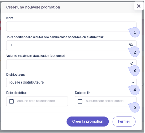 2. Le taux additionnel : taux additionnel que vous souhaitez proposer aux distributeurs sur la période donnée. Attention, il s'agit bien de rentrer le taux additionnel que vous souhaitez accorder et non le taux de commission total (exemple : +3%).